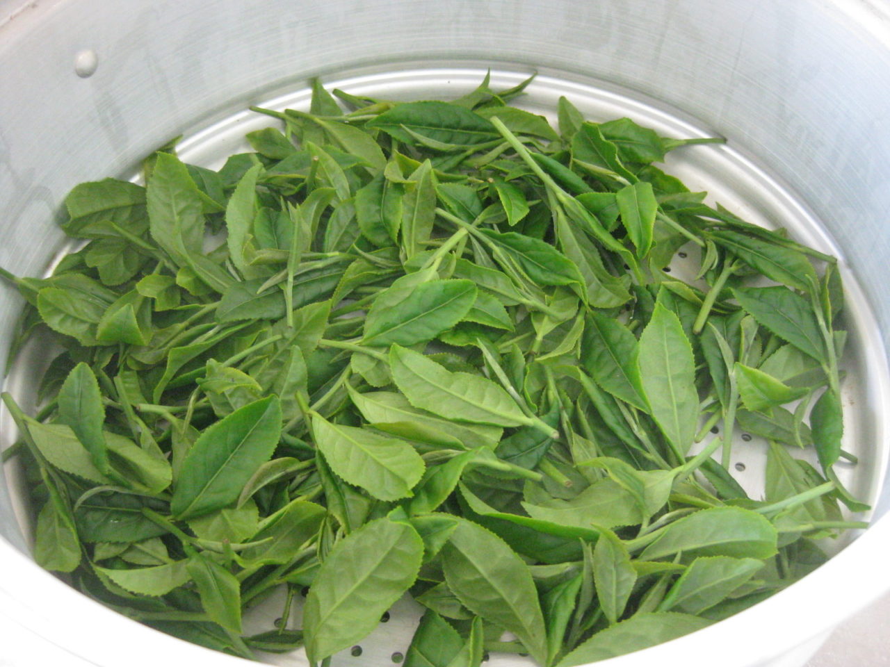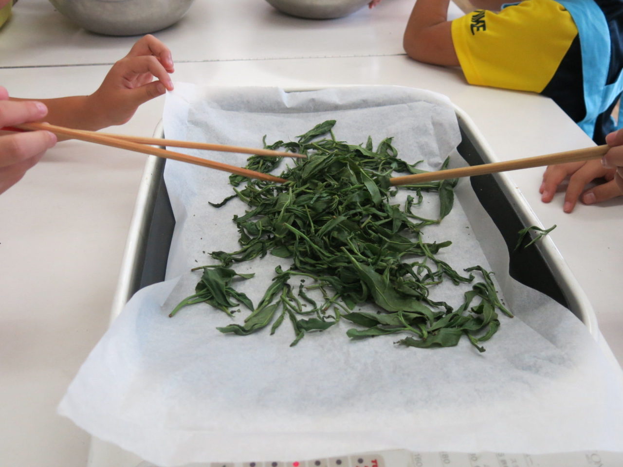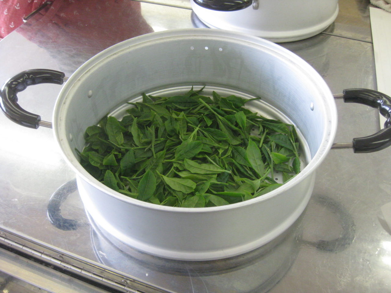 お茶の畑から新芽を摘み取り、家庭でも出来る方法で
