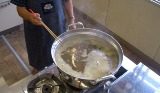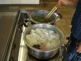 家庭用ナベ2Lの熱湯に牛乳大さじ2杯入れ布を10分間浸ける。
