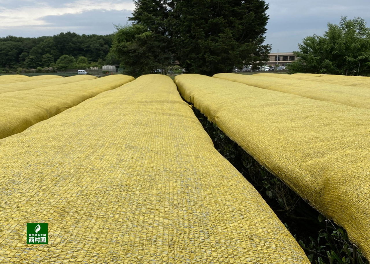 茶園に碾茶(てんちゃ)用被覆資材を春先から掛けています
